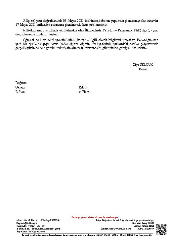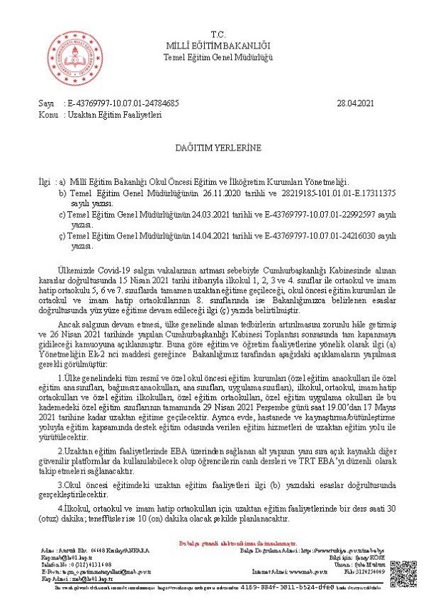 Milli Eğitim Bakanlığı Temel Eğitim Genel Müdürlüğünün 28.04.2021 tarih ve 24784685 sayılı ''Uzaktan Eğitim Faaliyetleri'' konulu yazısı: