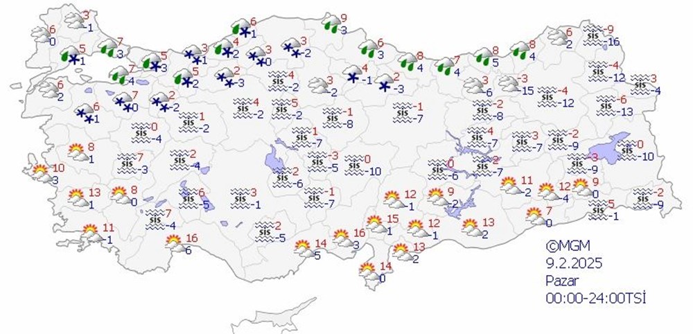 Doğu ve Güneydoğu'da pazar hava parçalı bulutlu, sabah sis ve şiddetli don var, Erzurum gece -18 derece. Öğle Malatya 0, Gaziantep 9 derece. Pazartesi Gaziantep, Diyarbakır, Malatya arasında yağmur ve kar olacak.