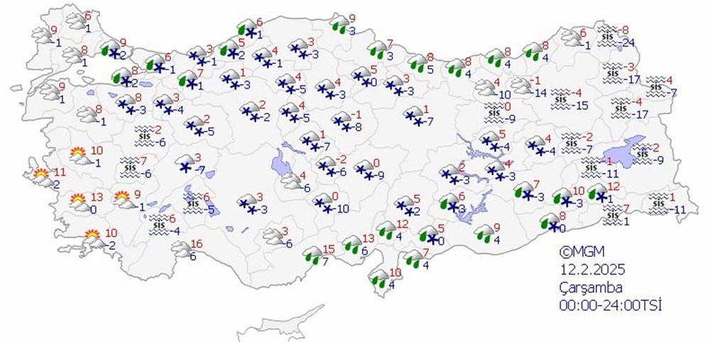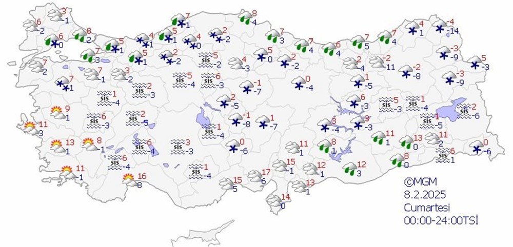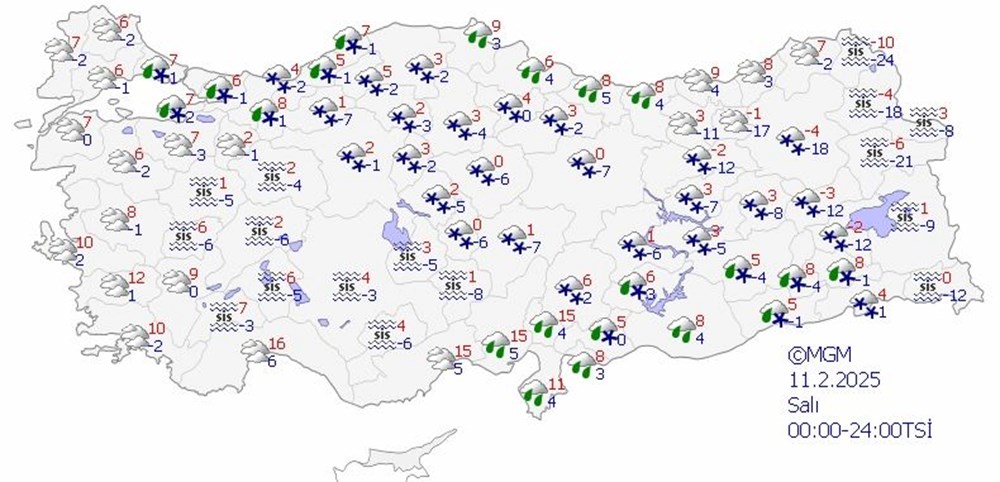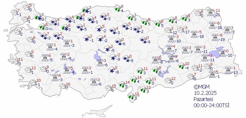 Meteoroloji Genel Müdürlüğü tarafından yapılan tahminlere göre: Ülke geneli parçalı ve çok bulutlu, Marmara’nın güney ve doğusu, İç Anadolu'nun doğusu, Karadeniz kıyıları ile Bolu, Tokat, Artvin çevreleri ve Doğu Anadolu'nun doğusu ile Malatya, Şanlıurfa, Diyarbakır çevrelerinin aralıklı yağışlı geçeceği, yağışların kıyı kesimlerde yağmur, iç kesimlerde karla karışık yağmur ve kar, Güneydoğu Anadolu’da hafif yağmur ve sağanak şeklinde görüleceği tahmin ediliyor. İç ve doğu kesimlerde buzlanma ve don ile birlikte sabah ve gece saatlerinde pus ve yer yer sis bekleniyor. Doğu Karadeniz’in iç kesimlerinin yüksekleri ile Doğu Anadolu’nun yüksek ve dik yamaçlarında çığ tehlikesi bulunmaktadır.